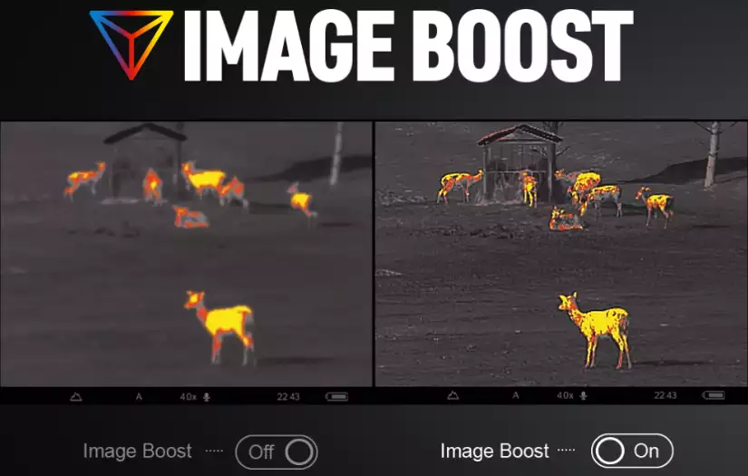 Immagini termiche nitide e ad alto contrasto consentono una migliore identificazione degli animali, dei loro arti e persino di dettagli più piccoli come rami, foglie, erba e terreno.