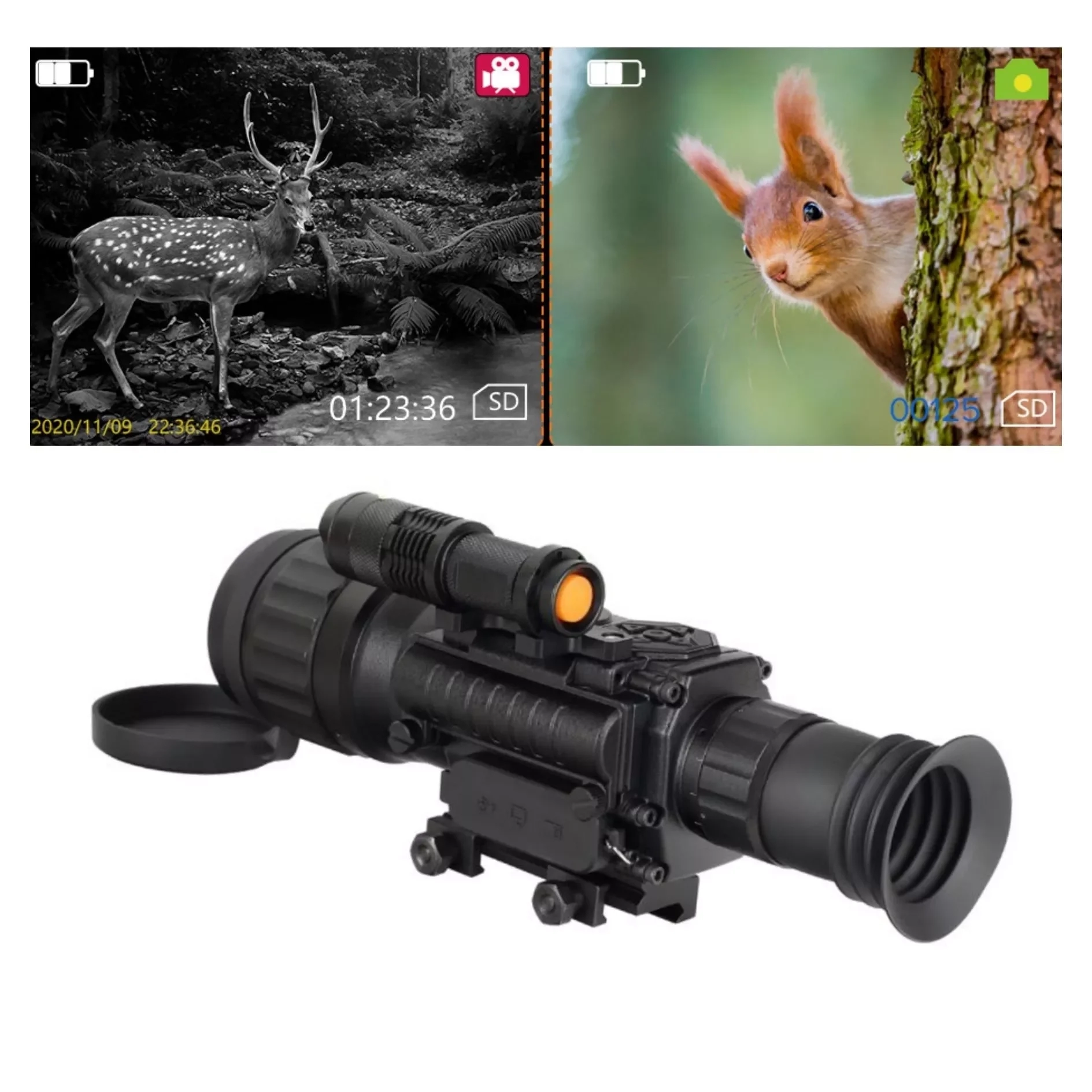 2. Raggio di rilevamento: rileva oggetti di dimensioni umane (1,8 m x 0,5 m) fino a 2.200 metri e animali delle dimensioni di una volpe (0,75 m x 0,5 m) fino a 1.350 metri. L'identificazione effettiva e la distanza per un tiro preciso dipendono dall'ottica, dal calibro e dall'abilità dell'utente.